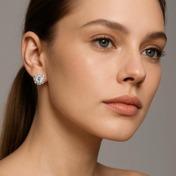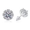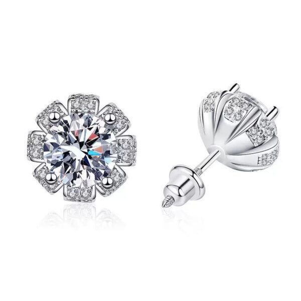 Each stud centers on a precision-cut moissanite that anchors the symmetrical floral silhouette, surrounded by evenly placed halo accents that add depth and balanced sparkle. The geometric petals and pavÊ-style surfaces provide subtle texture while maintaining a smooth, structured outline. A secure threaded backing enhances stability and keeps the stud flush to the ear, ensuring consistent light reflection across the full surface of the setting.
