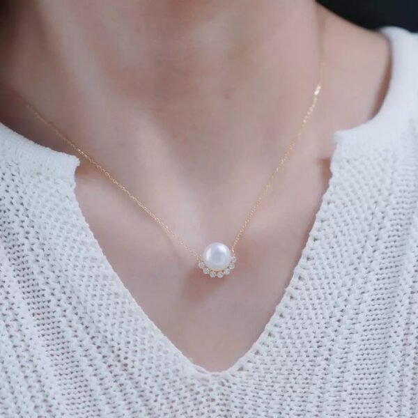 The smooth spherical pearl anchors the composition, framed by a precise curve of moissanites set that reflects light with measured brilliance. The open semicircle design highlights the contrast between the pearl’s soft luster and the crisp sparkle of the stones, creating a clean, symmetrical profile that rests naturally along the collarbone. Each component is aligned for visual balance, emphasizing clarity and proportion in form.