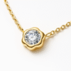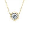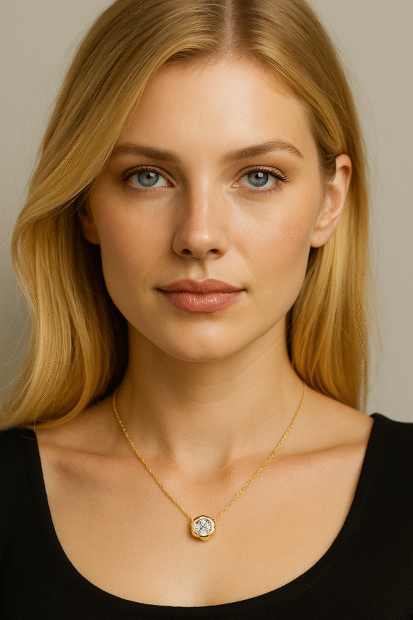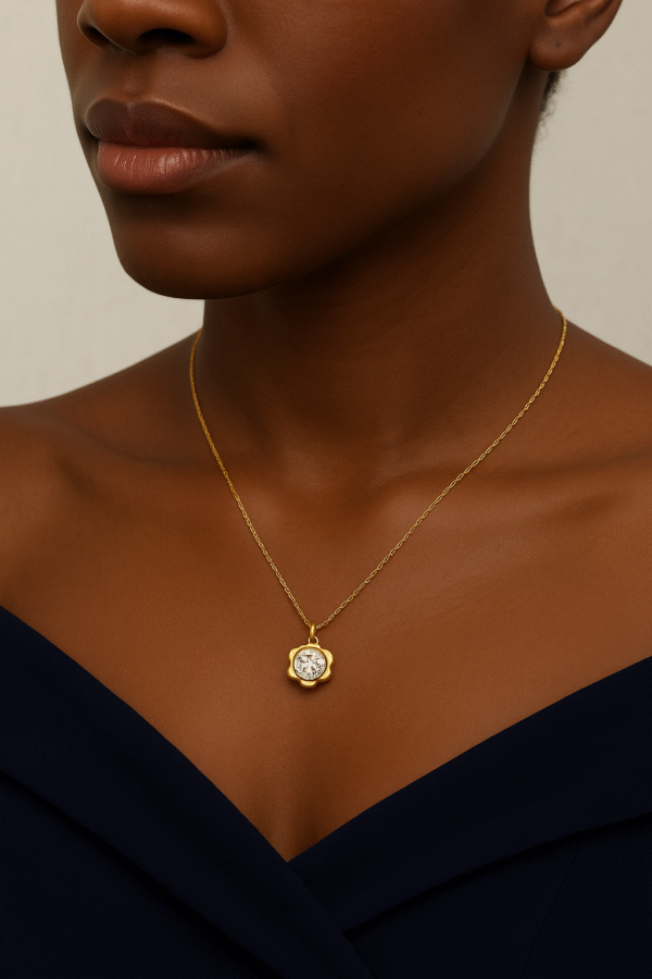 The 1-carat moissanite, graded DâE color and VVS1 clarity, sits precisely within a scalloped bezel that reflects light evenly across its facets. Each curve of the gold-plated setting is proportioned for balance, creating a clean visual transition from stone to chain. The fine cable chain and compact pendant structure form a unified profile that enhances the moissaniteâs brilliance while maintaining a sleek, minimal presence.