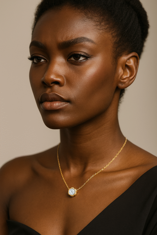 Designed for versatility, the adjustable chain allows a close or relaxed fit that layers naturally with other gold or moissanite pieces. Its neutral tone complements warm and cool palettes alike, moving effortlessly from day to evening styling. As part of Aestraâs modern jewelry collection, this piece functions as an everyday fine jewelry essential or a timeless gifting choice for milestone occasions.