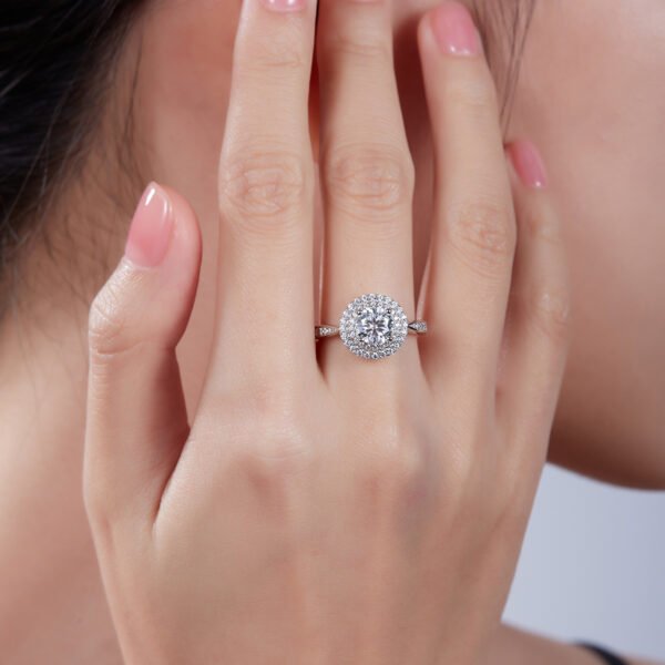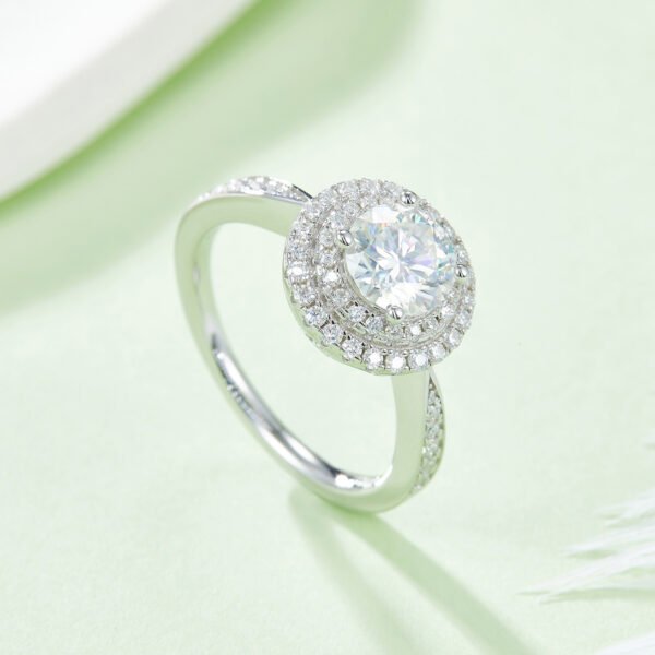 Ring: 1.0 carat round D color moissanite, designed for elegant everyday wear. Ring size: 7